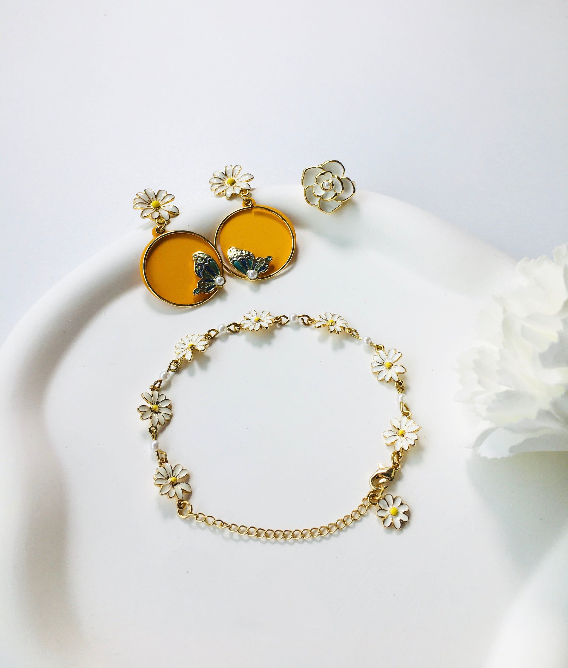 A charming jewelry set featuring delicate daisies, graceful butterflies, and luminous pearls. Includes matching earrings, bracelet, and adjustable ring.