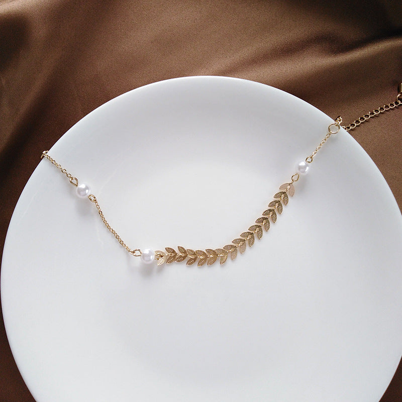 Asymmetric Leaf Decor Pearl Chain Necklace & Bracelet & Vintage Sun Earrings Jewelry Set