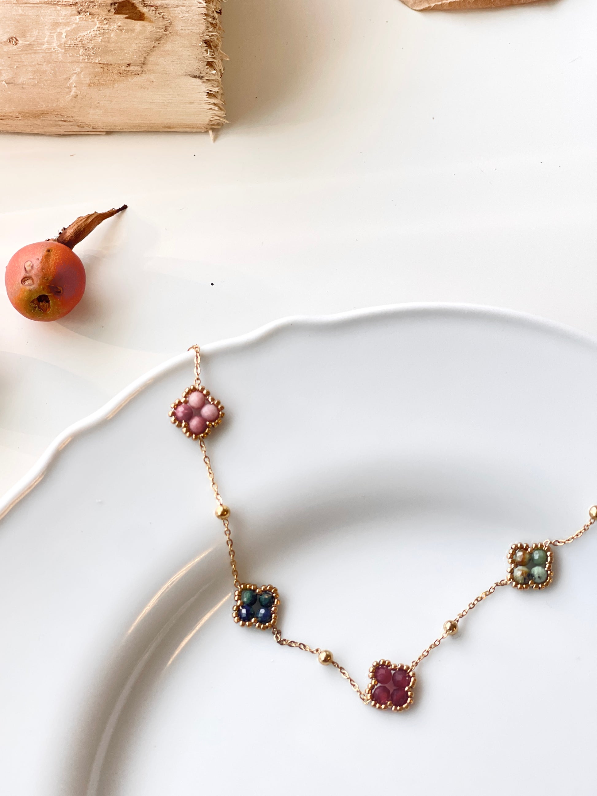 A gold-plated chain necklace set with gemstone blossoms in multicolor tones, including tourmaline, lapis lazuli, and African turquoise. Each stone is framed with beaded details for a refined finish.