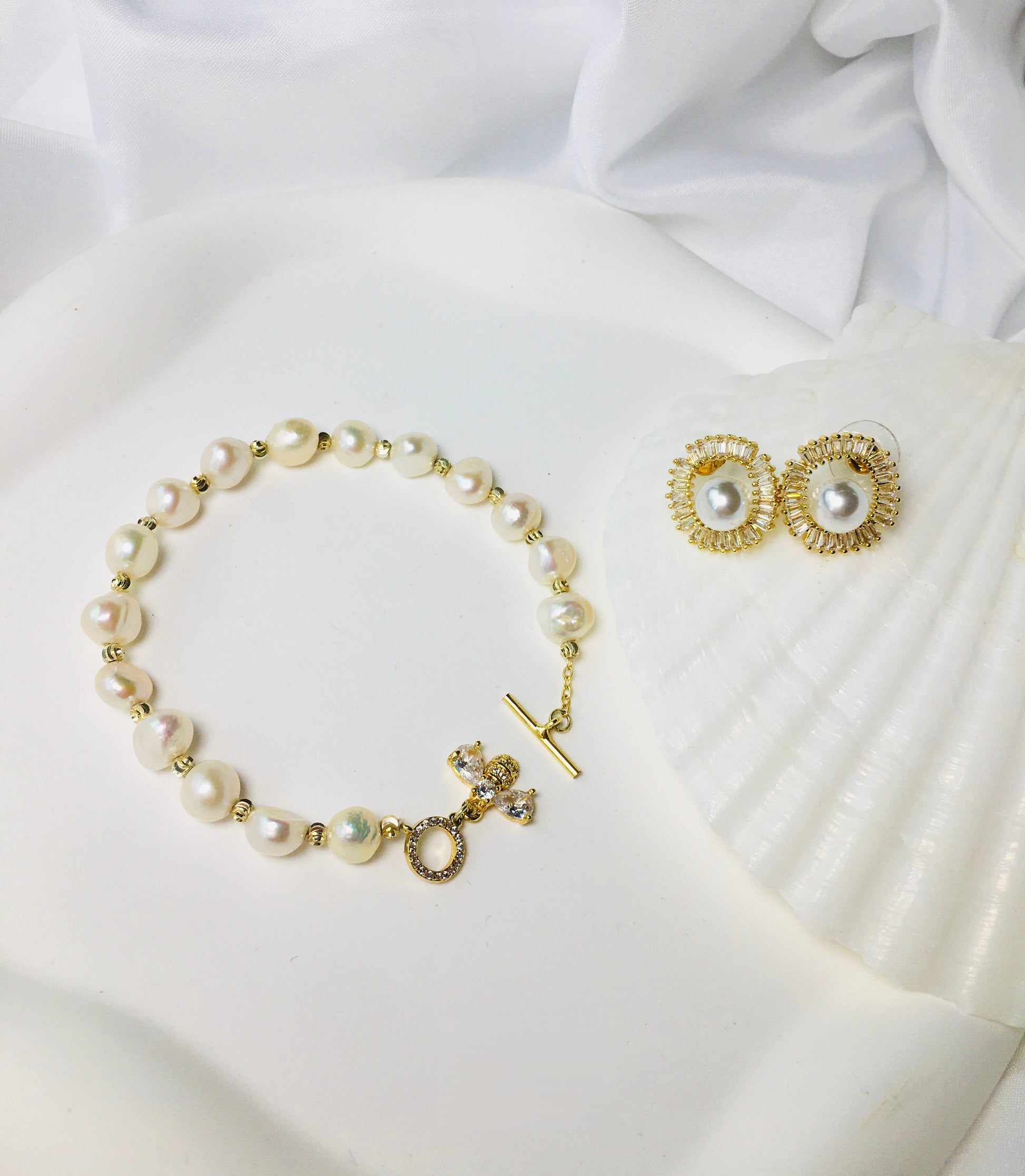 This elegant jewelry set features a gold-plated bracelet crafted with natural baroque pearls, accented by a sparkling crystal bee charm for a playful yet refined touch. Paired with classic crystal-pearl stud earrings framed in gold detailing.