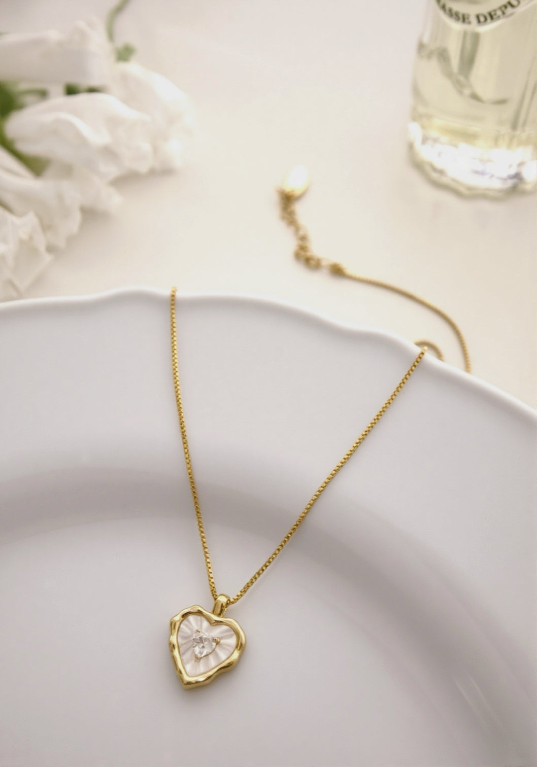 This delicate necklace features a fine chain paired with a heart-shaped mother-of-pearl pendant, showcasing a soft luster and a simple, elegant design.