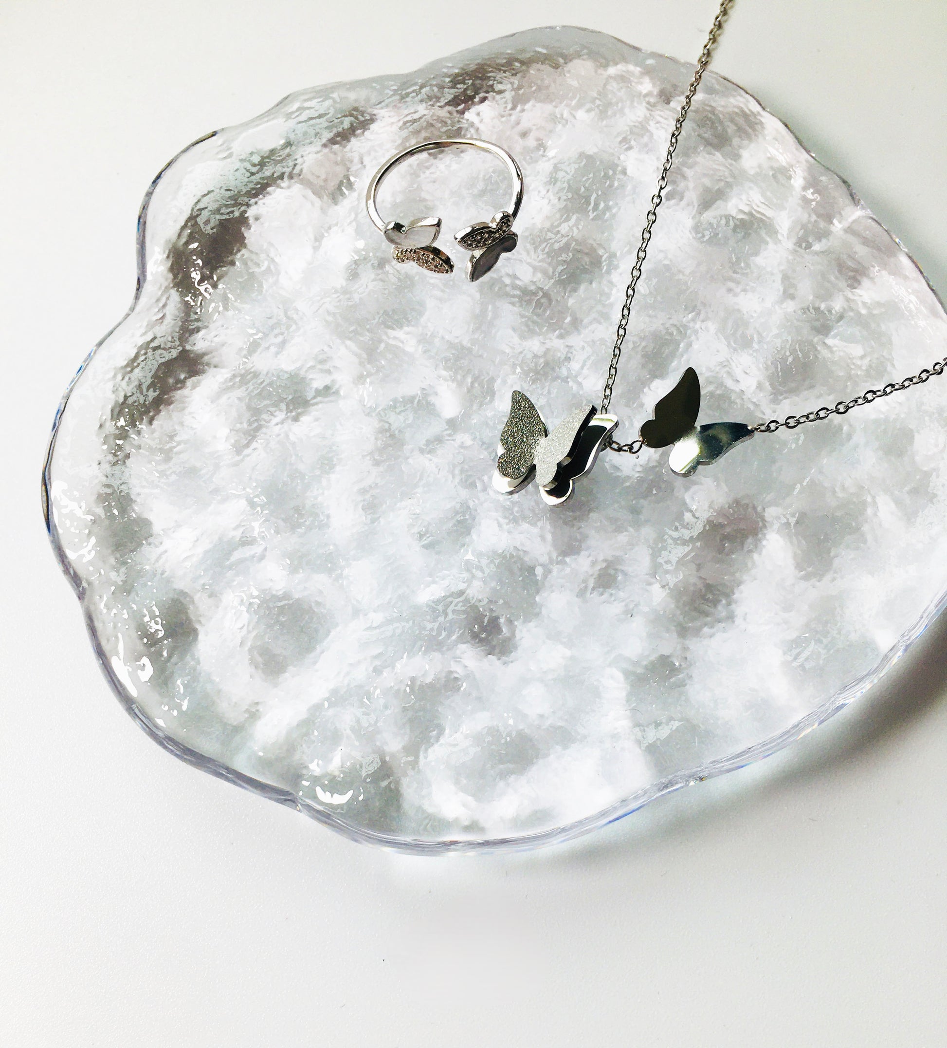 Silver Butterfly Charm Necklace & Rhinestone Ring Jewelry Set