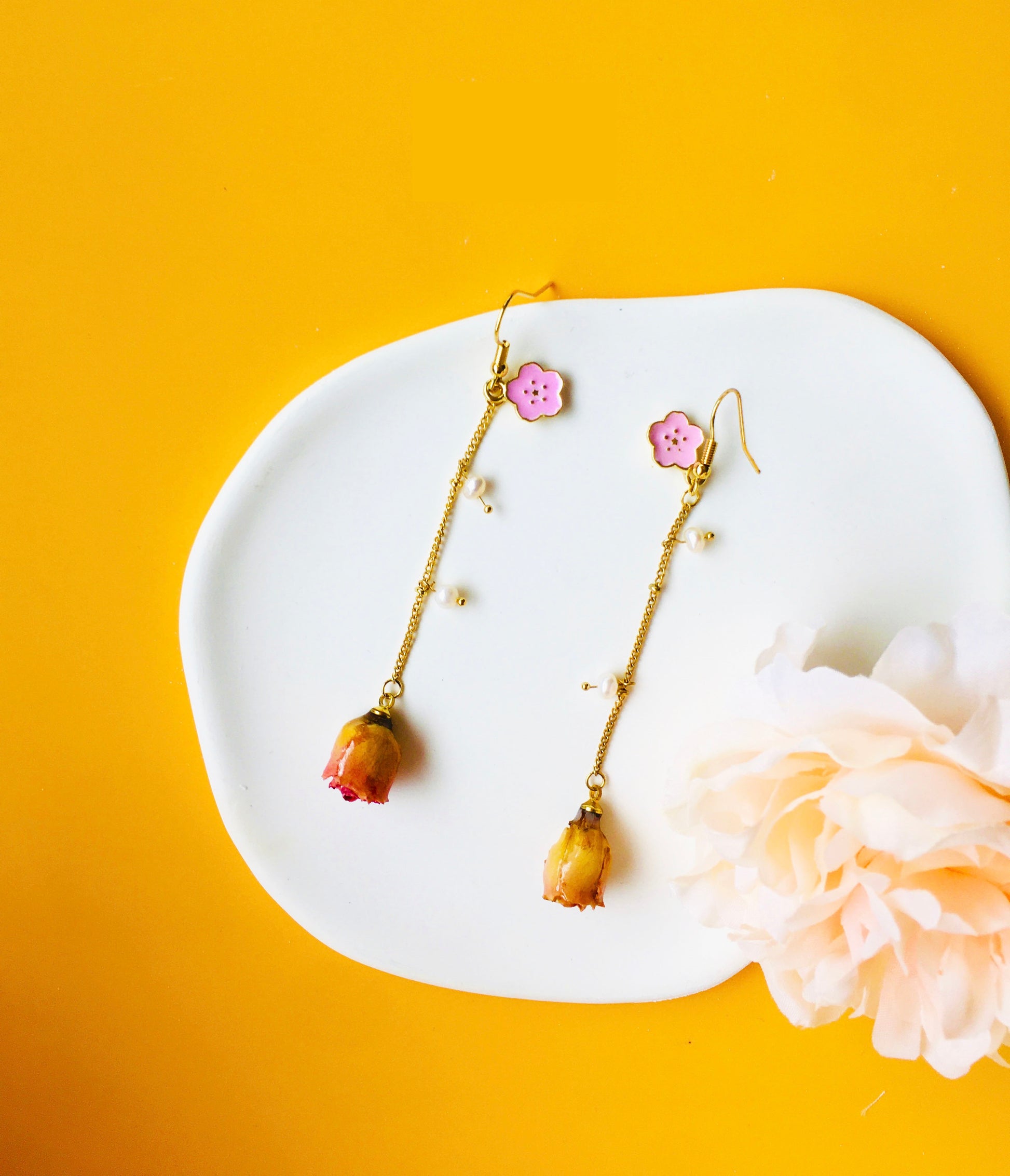 Yellow with Hotpink Rose Dried Flower with Pearl & Sakura Drop Earrings